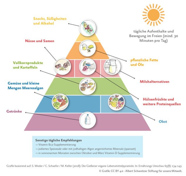 Unser Ernährungssystem ist darauf ausgelegt, dass sich Mischköstler:innen ohne großes Nachdenken nährstoffdeckend ernähren. Um dies zu gewährleisten, wird zum Beispiel das Futter der sogenannten »Nutztiere« mit Nährstoffen angereichert. Bei der veganen Ernährung sind wir leider noch nicht so weit, dass Alternativprodukte konsequent angereichert werden und somit eine Nährstoffabdeckung auch ohne Know-How gewährleistet ist. Aber keine Sorge, was zunächst kompliziert erscheinen mag, wird schon nach kurzer Zeit zur Selbstverständlichkeit. Unsere vegane Ernährungspyramide zeigt, welche Lebensmittel täglich auf dem Speiseplan stehen sollten, um sich ausgewogen zu ernähren. Auch Apps wie Dr. Greger’s Daily Dozen können den Einstieg erleichtern.