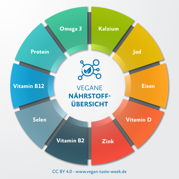 Aber auch andere Nährstoffe wie Kalzium, Jod, Selen, Vitamin D oder Omega-3-Fettsäuren sollten im Auge behalten und bei Bedarf ergänzt werden. In unserer Grafik finden Sie eine Zusammenstellung der wichtigsten Nährstoffe. Mit einem Klick auf die Grafik erhalten Sie Informationen, wie Sie diese Nährstoffe ohne Supplementierung decken können. Unser praktisches Nährstoffposter können Sie hier herunterladen und als Erinnerung in der Küche aufhängen.