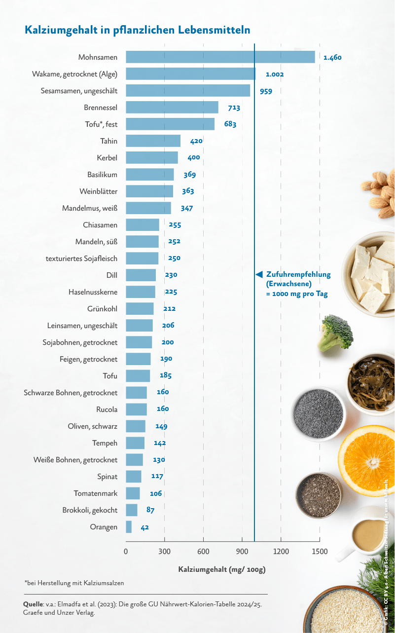 Eine 2022 durchgeführte Studie ergab allerdings, dass Veganer:innen im Vergleich zu Mischköstler:innen eine signifikant niedrigere Kalziumzufuhr aufweisen. Da sich ein Mangel oft erst nach Jahren bemerkbar macht, empfehlen wir, die Lebensmittel von Beginn an sorgfältig zusammenzustellen.