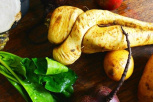 Die ganze Kurkumawurzel kann z. B. in diesem Vitamin-C-reichen Smoothie verarbeitet werden. Eine Messerspitze Kurkuma schmeckt man kaum, färbt aber Soßen wie diese Hollandaise ganz ohne Ei schön gelb.