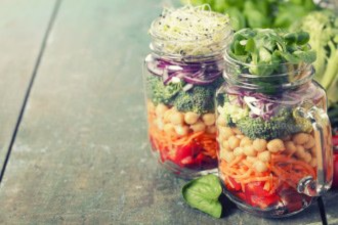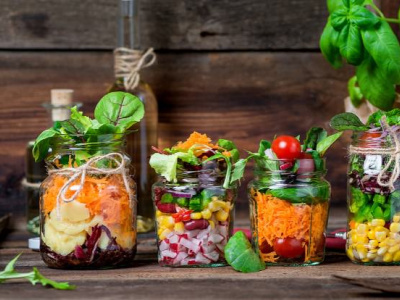 Sofort verzehrfertig ist die Salat-Variation mit Couscous, Quinoa, Reis oder Hirse als Sättigungsbeilage. Obst, Nüsse und Gemüse können nach Belieben hinzugegeben werden. Als Dressing eignen sich ein einfaches Joghurt-Dressing, Vinaigrette oder Grüne Soße. Geben Sie zuerst das Dressing ins Glas; dann folgt Gemüse, dem es nichts ausmacht, eine Weile im Dressing zu liegen – etwa Tomaten, Gurke, Brokkoli, Karotten, Blumenkohl, Spargel oder Paprika. Darüber geben Sie empfindlicheres Gemüse wie Bohnen, Sprossen, Mais oder Avocado. Nun folgt die Sättigungsbeilage nach Wahl. Zum Schluss geben Sie die Salatblätter hinzu. So wird sichergestellt, dass der Salat vor dem Dressing geschützt ist und nicht matschig wird.