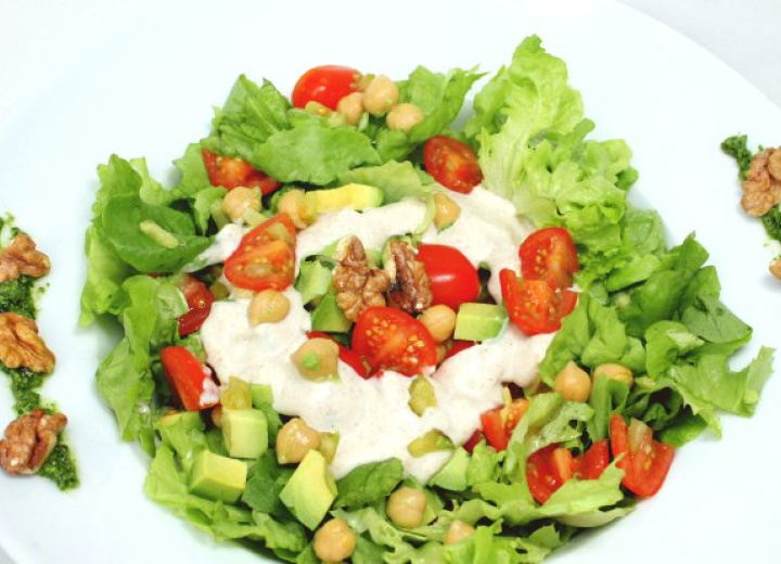 Für das Dressing den Joghurt, das Tahin und das Knoblauchpulver in einer kleinen Schüssel verrühren. Anschließend das Dressing mit dem Salat vermengen.