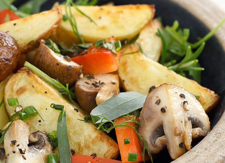 Die Kartoffeln aus dem Ofen nehmen, sobald sie außen gebräunt und innen gar sind, und kurz abkühlen lassen. Zu den restlichen Zutaten in die Salatschüssel geben und alles gut mit dem Dressing mischen. Den Salat mit Salz und Pfeffer abschmecken und auf einem Bett aus Rucola oder Wildkräutern servieren.