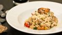 Die Champignons putzen, falls nötig trocken abreiben und je nach Größe halbieren oder vierteln. Das übrige Olivenöl in einer Pfanne erhitzen, die Champignons darin circa 4 Minuten bei mittlerer Hitze anbraten und leicht salzen. Die Paprika putzen, waschen und in mundgerechte Stücke schneiden. Schnittlauch, Dill und Oregano waschen und mit Paprika und Pilzen in eine Salatschüssel geben. Den Rucola oder die Wildkräuter waschen und trocken schleudern.