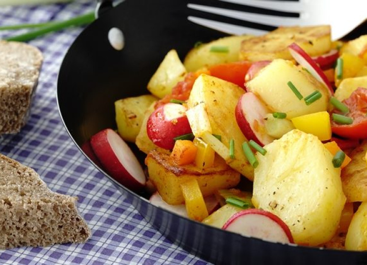 Zum Schluss das zur Seite gestellte Gemüse sowie zusätzlich die Radieschenscheiben mit in die Pfanne geben und alles vorsichtig unterheben. Wer möchte, kann die Bauernpfanne mit Räuchertofu oder Wiener Würstchen (z. B. von Hobelz oder Taifun) ergänzen. Alles mit Schnittlauch bestreuen und heiß servieren.