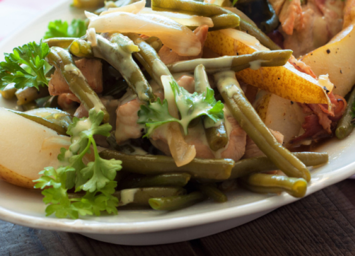 Kartoffeln, Bohnen, Birnen und Tofu auf einem Teller anrichten und mit der Soße begießen.