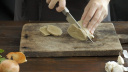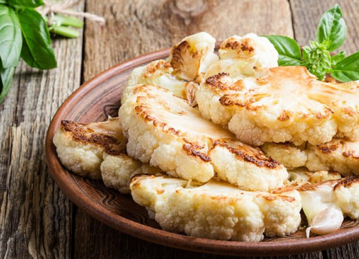 Den Blumenkohl von den grünen Blättern befreien und von der Mitte aus in vier etwa zwei cm dicke Scheiben schneiden und auf das Backpapier legen.