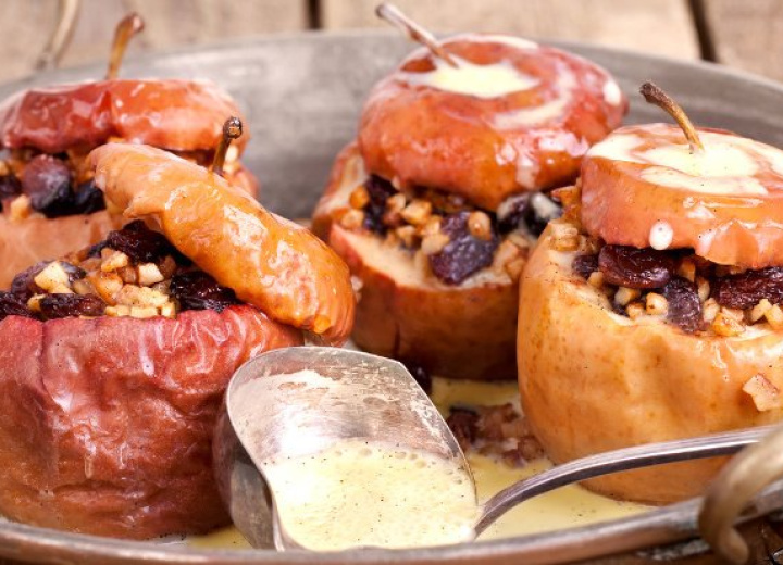 Sobald die Äpfel goldbraun und weich sind, diese auf tiefen Tellern anrichten und mit Vanillepudding übergießen. Nach Geschmack mit gehackten Nüssen und Rosinen bestreuen.