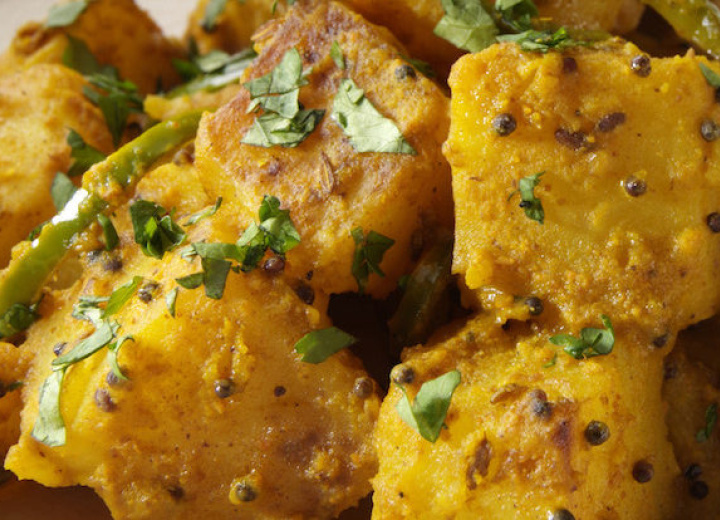Das Erdnussöl in eine große, tiefe Pfanne geben und auf hoher Stufe erhitzen. Kreuzkümmel- und Koriandersamen hineingeben und kurz pfannenrühren, bis sie zu platzen beginnen. Dann den gehackten Ingwer und die Chilistreifen hinzufügen und einige Sekunden braten. Die Hitze reduzieren und Asant, Kurkuma, Chiliflocken und Amchoor dazugeben und einige Sekunden pfannenrühren. Die Kartoffeln in die Gewürzmischung geben, mit Salz abschmecken und gut mit der Gewürzmischung vermengen. 5–6 Minuten unter gelegentlichem Rühren braten. Den frisch gehackten Koriander einrühren und das Gericht heiß servieren.