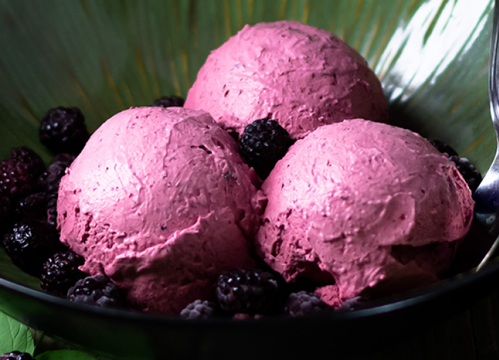 Dieses Rezept für veganes Brombeer-Eis stammt vom Blog Eat healthy eat happy.