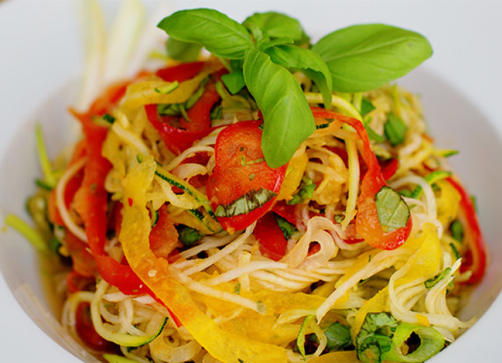 Zucchini und Kohlrabi mit einem Spiralschneider zu dünnen Gemüsenudeln verarbeiten. Bei den Paprika den Stielansatz in die Frucht drücken und entfernen. Die Paprika im Ganzen in den Spiralschneider spannen und mit dem langen, fest integrierten Messer zu feinen Nudeln verarbeiten.