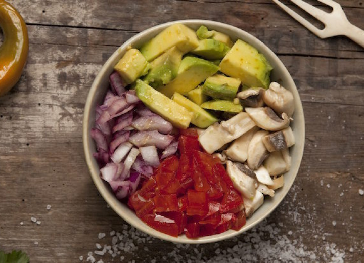 Rote Zwiebel und Avocado klein schneiden und zu den Tomaten geben. Champignons vom Saft abschöpfen und dazugeben. Koriander und Chili (nach Geschmack) kleinhacken und mit den restlichen Zutaten vorsichtig vermischen. Zuletzt Olivenöl und Salz hinzufügen.