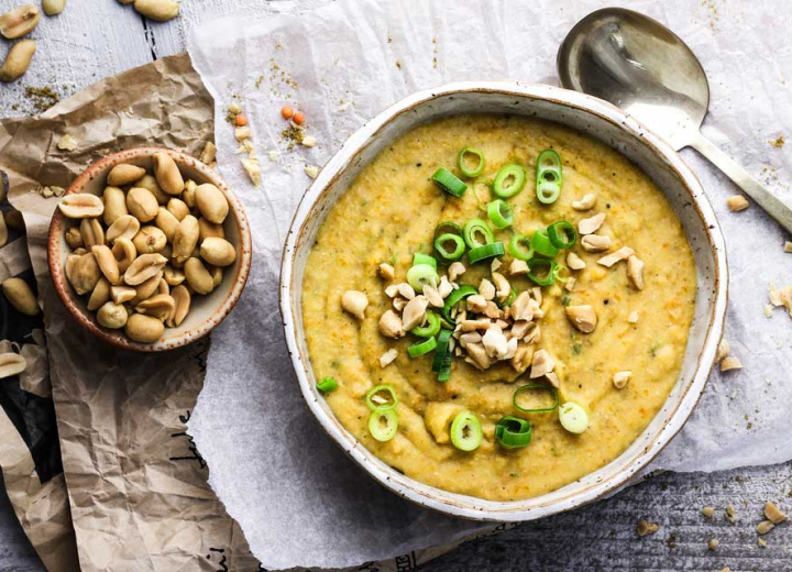 Anschließend alles pürieren und Erdnüsse unterrühren. Mit Kreuzkümmel, Salz und Pfeffer abschmecken.