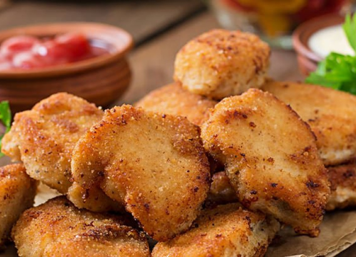 Die Nuggets in heißem Pflanzenöl bei 180 Grad für sieben Minuten frittieren, bis sie goldbraun und knusprig sind.