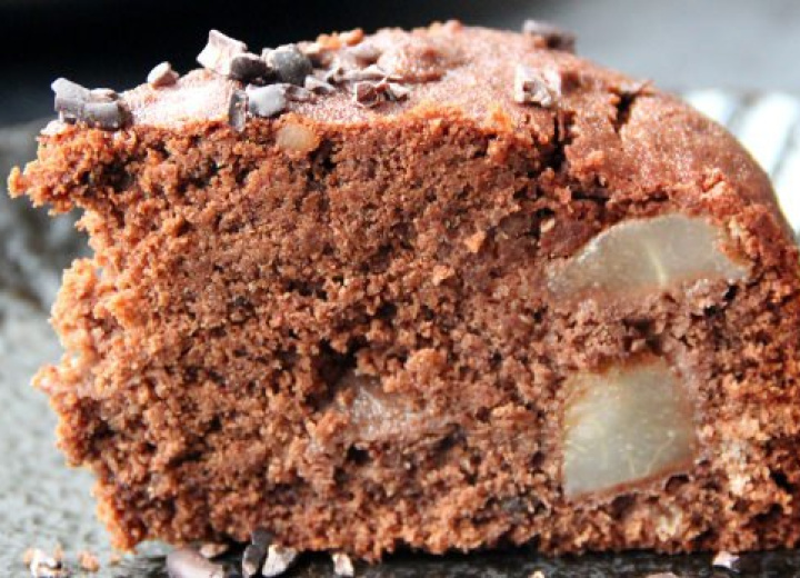 Die Birne schälen, entkernen und in Würfel schneiden. Zusammen mit den Kakaonibs vorsichtig unter den Teig mischen.
