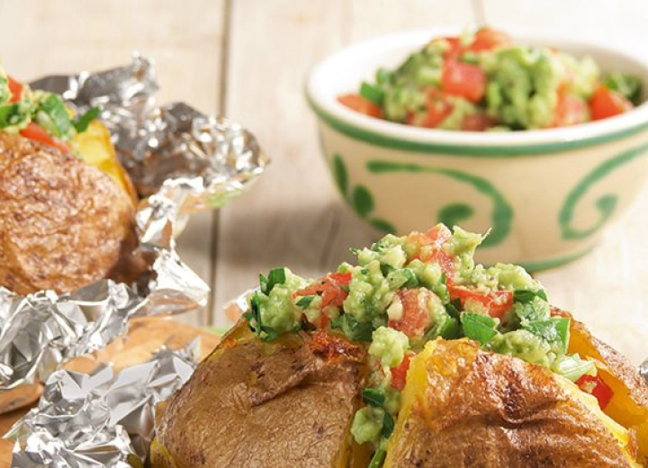 Avocados halbieren, Kerne entfernen, Fruchtfleisch aus der Schale lösen und mit einer Gabel fein zerdrücken. Zitronensaft, Knoblauch, Chili und Frühlingszwiebeln unterrühren und mit Salz und buntem Pfeffer abschmecken. Tomatenwürfel und Petersilie unterheben. Die Grillkartoffeln mit dem Avocado-Dip servieren.