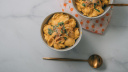 Den Grünkern zusammen mit den Sonnenblumenkernen, den Haferflocken, der kleingeschnittenen Knoblauchzehe und dem Gemüsebrühepulver in einen Topf geben.