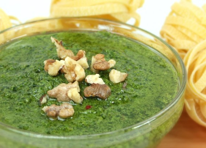 Die Nudeln nach Packungsanweisung zubereiten. Die Grünkohlblätter waschen und die Stängel entfernen. Die Walnüsse zuerst kurz in einer Pfanne anrösten (ohne Öl) und dann in einen Mixer geben und zermahlen. Nun die Grünkohlblätter, die Knoblauchzehe, das Olivenöl und die Hefeflocken dazugeben und alles kräftig mixen, bis eine relativ glatte Masse entsteht.