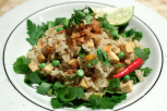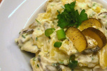 Den abgekühlten Hefeschmelz nun in einen Gefrierbeutel füllen und die Spitze einer Ecke abschneiden. Der Käseersatz kann so gut über dem Auflauf verteilt werden.