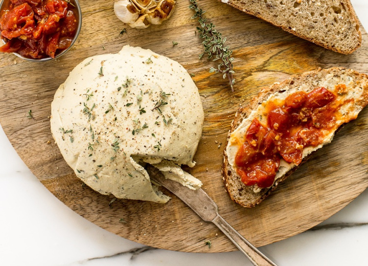 Den gekühlten Cashewkäse mit Meersalz, schwarzem Pfeffer und Kräutern garnieren und servieren.
