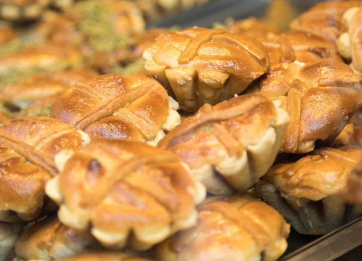 Den restlichen Teig nochmals ausrollen und in 1 cm breite Streifen schneiden. Je zwei Streifen auf jedem Gebäck drapieren, sodass ein Kreuz entsteht (siehe Foto), und die Streifen an den Rändern andrücken.