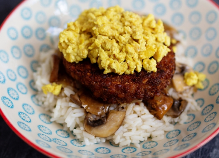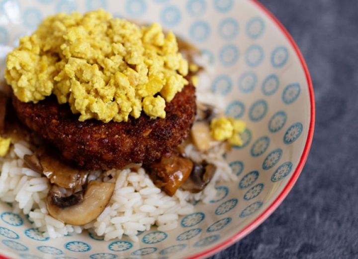 Die Patties nach Packungsangabe zubereiten, auf den Reis legen und mit Soße übergießen. Das Rührei über die Patties geben und wenn gewünscht eine Scheibe veganen Käse darüberlegen.