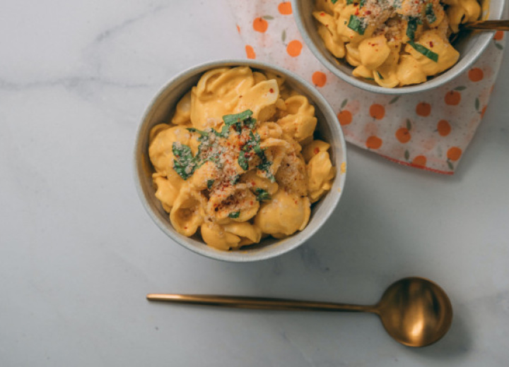 Die Nudeln nach Packungsanleitung kochen und währenddessen den fein gehackten Knoblauch in etwas Öl anbraten. Den goldbraunen Knoblauch, die Soja- oder Mandelmilch, Gemüsebrühe, Hefe- und Chiliflocken zum Kürbispüree in den Mixer geben und nochmals pürieren. Das Püree in einen Topf geben und unter Rühren 5 Minuten kochen.
