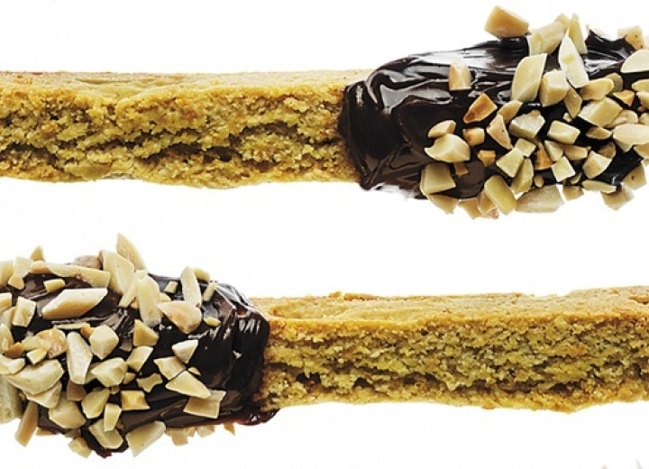 Die Rechtecke mit einem scharfen Messer der Länge nach in 1,5 cm breite Scheiben schneiden. Die Scheiben flach aufs Backblech legen, wieder in den Ofen schieben und erneut 30 Minuten goldbraun backen. Vollständig abkühlen lassen.