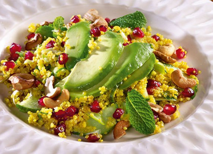Die Avocado halbieren, den Stein entfernen, die Frucht aus den Schalen lösen und dann längs in Streifen schneiden. Den Quinoasalat auf Tellern anrichten und mit Cashewkernen und Avocado garniert servieren.