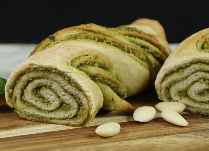 Den Teig auf der bemehlten Arbeitsfläche zu einem circa 45 mal 30 Zentimeter großen Rechteck ausrollen. Anschliessend gleichmässig mit dem Pesto bestreichen, dabei einen kleinen Rand freilassen. Dann den Rand von der langen Seite her aufrollen. Mit einem scharfen Messer die Teilrolle auf beiden Seiten bis zur Mitte halbieren. Die Teigstränge miteinander verdrehen und das Brot auf ein mit Backpapier belegtes Blech legen.