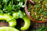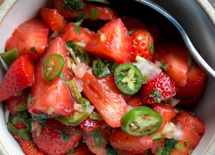 Melone oder Erdbeeren fein würfeln. Die Jalapeño fein hacken (optional die Kerne und Innenwände vorher entfernen, da diese die meiste Schärfe tragen). Den Koriander und die Zwiebel ebenfalls fein hacken. Optional Tomaten und Gurke fein würfeln.