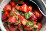 Für die Salsa die Tomaten und Pfirsiche würfeln, Zwiebel und Koriander fein hacken.