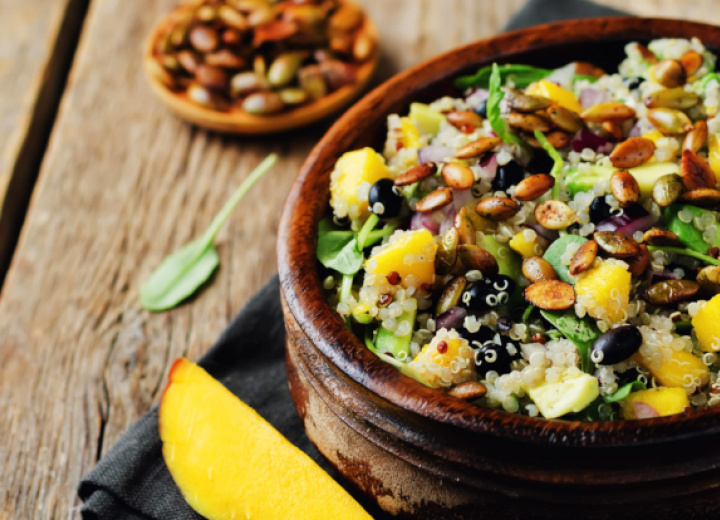 Die abgekühlte Quinoa mit den Bohnen, Essig und Öl vermischen. Dann die Salsa unterheben und den Salat mit Salz, Pfeffer und Limettensaft abschmecken.