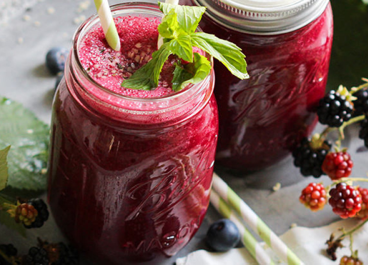 Die Rote Bete gut waschen, etwas schälen und klein schneiden. Zusammen mit den Brombeeren und Heidelbeeren, den Hanfsamen, einer geschälten Zitrone, dem Agavendicksaft und den Minzblättern in einen leistungsstarken Mixer geben. Das Kokoswasser bzw. das kalte Wasser aufgießen und alles zu einem sämigen Smoothie mixen. Den Smoothie mit Hanfsamen und Minze garniert kalt servieren.