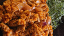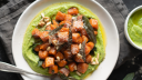 Alles auf der Platte locker miteinander vermischen und die halbierten Kirschtomaten darauf verteilen. Den Salat mit den gehackten Korianderblättern und den Frühlingszwiebeln garnieren. Etwas cremiges Knoblauch-Dressing darüber träufeln und nach Wunsch den Salat leicht mit dem Chilipulver bestreuen.