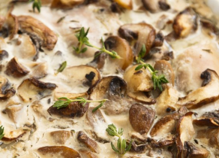 Die Pilze putzen und in Scheiben schneiden. Dann mit Öl in einer großen Pfanne anbraten und mit Salz und Pfeffer würzen. Tipp: Rauchsalz passt erstaunlich gut ins Frikassee. Wenn die Pilze braun aber noch saftig sind, großzügig mit Mehl bestäuben.