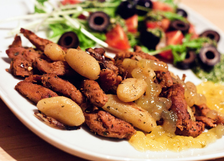 Dieses Rezept für Schupfnudel-Gyros-Pfanne stammt vom Blog Vegan