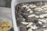 Die Pflanzenmilch mit dem Mehl, dem Pflaumenwasser, dem Eiersatz und ggf. etwas Zucker verrühren und über den Auflauf gießen. Darauf einige Margarineflöckchen verteilen.
