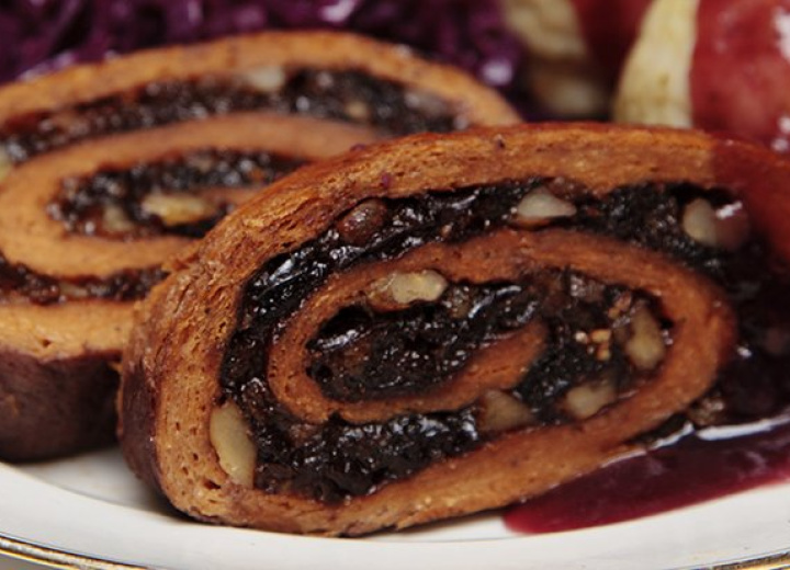 Zum Braten passen ganz klassisch Rotkohl und Knödel sowie eine köstliche Rotwein-Pflaumensoße: