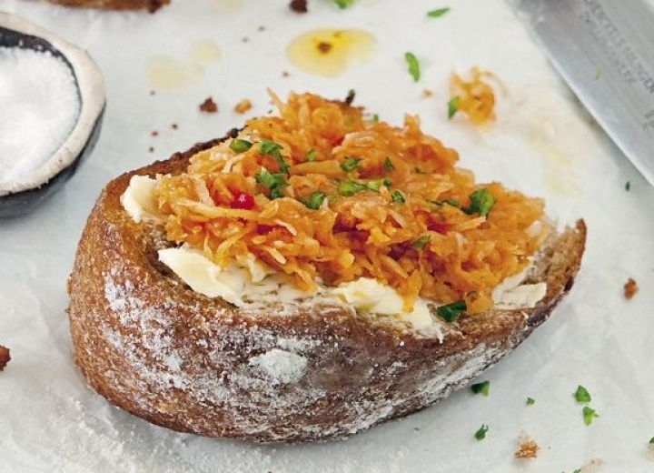 Für den Aufstrich: Sellerie säubern, schälen und fein raspeln. Mit Senf, Tomatenmark*, Essig, Salz und Zucker vermengen, ca. 15 Minuten ziehen lassen. Ganz nach Geschmack entweder 1 TL Tomatenmark oder 1 TL Pflanzenbutter auf eine geröstete Brotscheibe streichen und den Sellerieaufstrich sowie gehackte Petersilie darüber geben.