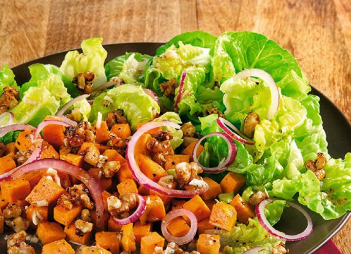 Walnusskerne grob hacken. Zucker in einer beschichteten Pfanne karamellisieren, Walnusskerne und Chiliflocken unterrühren und aus der Pfanne nehmen. Salat, Zwiebeln und Süßkartoffeln anrichten, mit Dressing beträufeln und mit Chili-Walnüssen garniert servieren. Schmeckt gut dazu: geröstetes Fladenbrot.