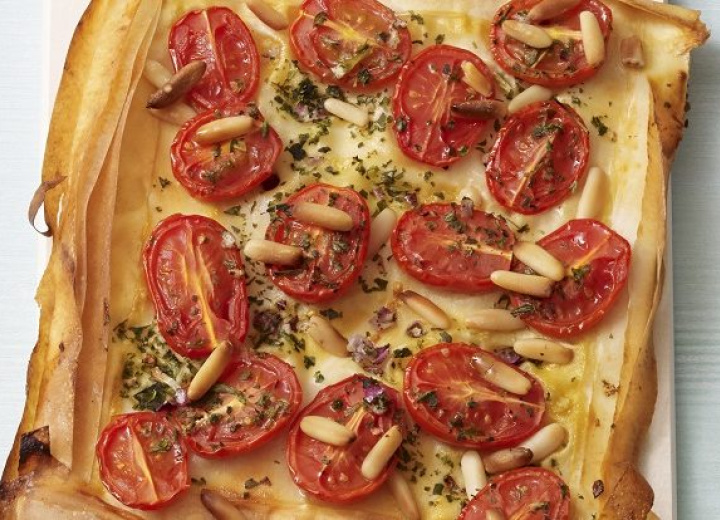 Teigstapel mit Knoblauchsenf bestreichen. Die Ränder rundherum jeweils ca. ½ cm einklappen und fest andrücken. Die Tomaten mit den Schnittflächen nach oben auf die Tartelettes setzen. Mit Salz und Pfeffer würzen und mit den Kräutern sowie den Pinienkernen bestreuen.