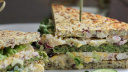Der Zwiebelkuchen kann vorsichtig gestürzt oder aus der Form serviert werden. Die Lauchzwiebeln hacken und zum Garnieren verwenden.