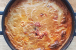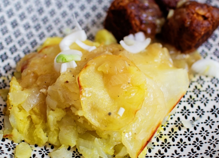 Die letzte Schicht ist aus Kartoffeln. Mit dem Butteröl oder geschmolzener Margarine bestrichen und den Zwiebelkuchen mit Alufolie abdecken.