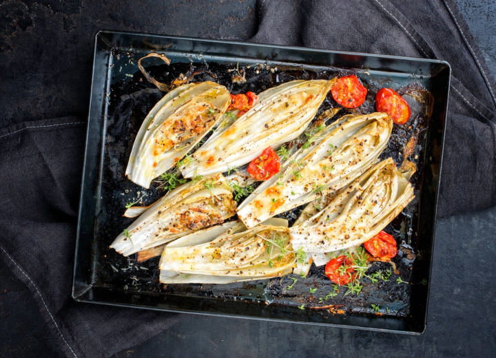 Den Chicorée waschen, längs halbieren und mit der Schnittseite nach unten in eine Auflaufform legen.