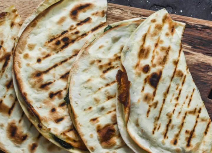 Die Quesadillas nun vorsichtig auf dem Grill platzieren und von beiden Seiten goldbraun grillen, bis der Käse geschmolzen ist.