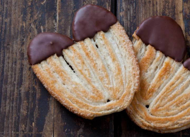 Für ca. 10 Minuten backen, bis die Ohren die gewünschte Bräune haben. Dann abkühlen lassen und die Schokolade im Wasserbad schmelzen. Die Schweineohren nun zur Hälfte in die Schokolade tauchen oder mit der Schokolade bestreichen.