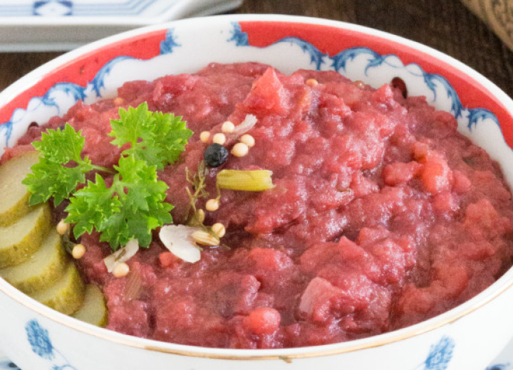 Die Rote Bete mit den Gewürzgurken im Mixer grob zerkleinern.