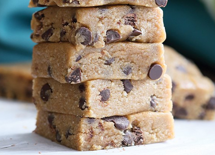 Salz, ¾ des Hafermehls, gemahlene Mandeln und den Rohrzucker untermischen. Das restliche Hafermehl in kleinen Portionen untermischen, bis die Masse die Konsistenz eines weichen Teigs hat. Der Teig wird etwas fester, sobald er gekühlt wird. Die Schokoladenchips untermischen. Den Teig 30 Minuten im Kühlschrank ruhen lassen und dann mit einem kleinen Eisportionierer Kugeln daraus formen oder den Teig auf Backpapier ausbreiten, noch mal 15 Minuten kalt stellen und dann in Riegel schneiden und servieren oder im Kühlschrank aufbewahren.