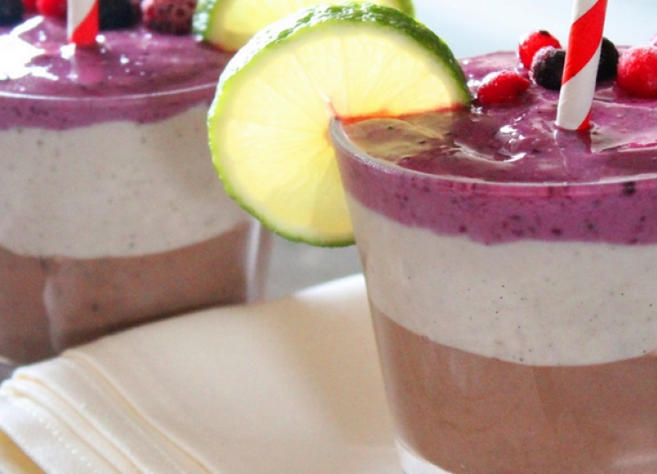 Die Zutaten für die untere Schicht in einen Mixer geben, zu einer cremigen aber trinkbaren Masse verarbeiten und anschließend auf zwei Gläser verteilen. Mit den Zutaten für die anderen Schichten ebenso verfahren. Die Reihenfolge der Schichten können Sie nach Belieben variieren. Je nach Leistung Ihres Mixers kann es empfehlenswert sein, die Beerenmischung vor dem Mixen aus dem Gefrierfach zu nehmen und etwa 10 Minuten antauen zu lassen.